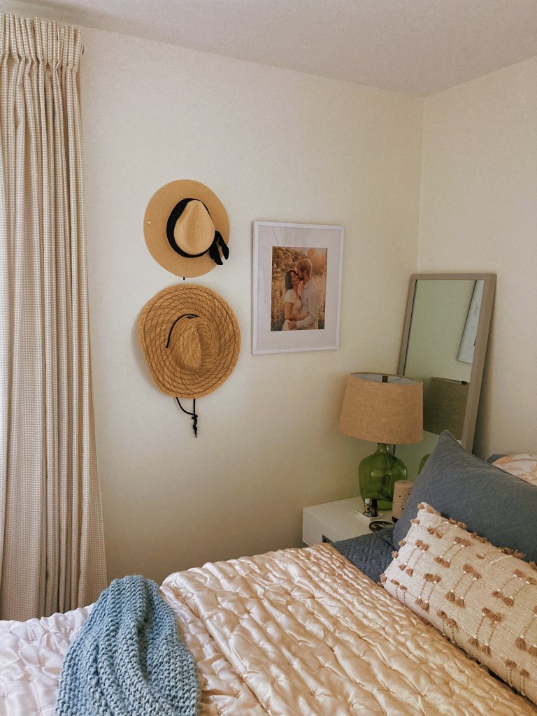 The hats on our wall we wore on our honeymoon! I love the texture they add to the walls and the fact that they hold a special memory.