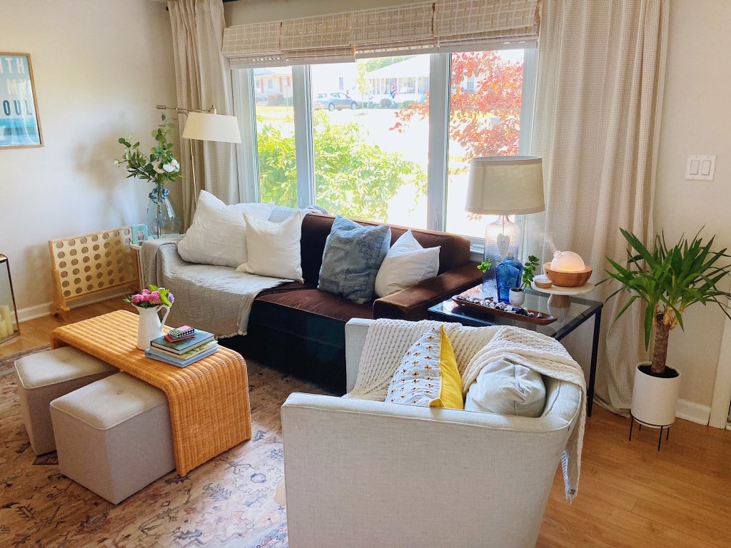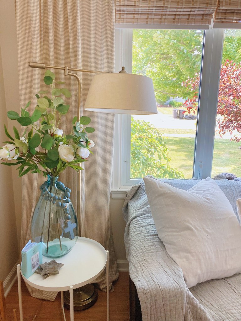 When it comes to summer decorating, lightening up spaces with color is often recommended (and a great idea!), but what can sometimes be overlooked is the the concept of lightening a room spatially. I decided to lighten our living room by removing decorative items from our coffee table, like candles and a dish that really weren’t serving any purpose. Putting fresh cut flowers and some reading material in their place was an easy swap that brought nature in, and gave some room to breathe.