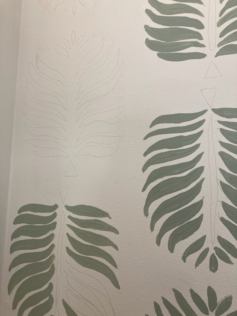 For this pattern I did one section of the stencil, then flipped it upside down for the next leaf. In the second column I did a half drop of the palm leaf. This made it so the palm leafs fell in between each other as opposed to side by side. My strategy was to work two columns at a time tracing then painting.