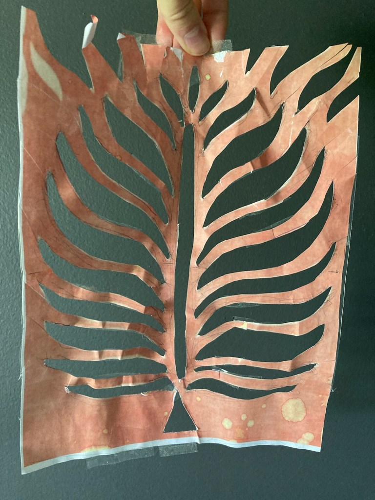 Once I found the paper I wanted to recreate, I had to make a stencil for it. For this project I decided that to keep things simple, I would make my template 8.5″x11″ (standard printer paper size). Start by screen grabbing one part of the pattern you will be repeating, in this case one palm leaf, and copying it into a word document. Next, stretch the image to fit the size you would like it to print at, for this project, the whole sheet of paper. Press print.