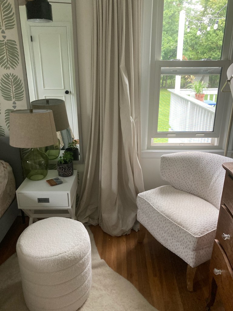As a rule of thumb, a window shouldn’t look like it is wearing “floods,” or have curtains that are too short. On the other hand, ones that are too long will create puddling on the ground, and have a romantic, relaxed feel. At first, I was okay having this look in our home, but after months of vacuuming and cleaning underneath them, I came to realize they were dust traps! Ideally the curtains should “kiss the floor” for a perfect length. Below is a before of the curtains puddling in our bedroom followed by an after, once they had been hemmed.
