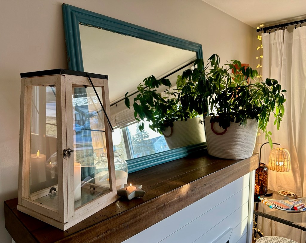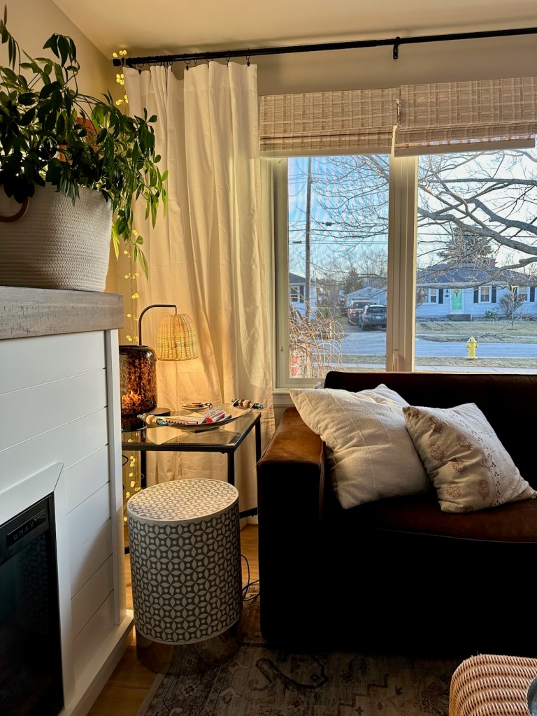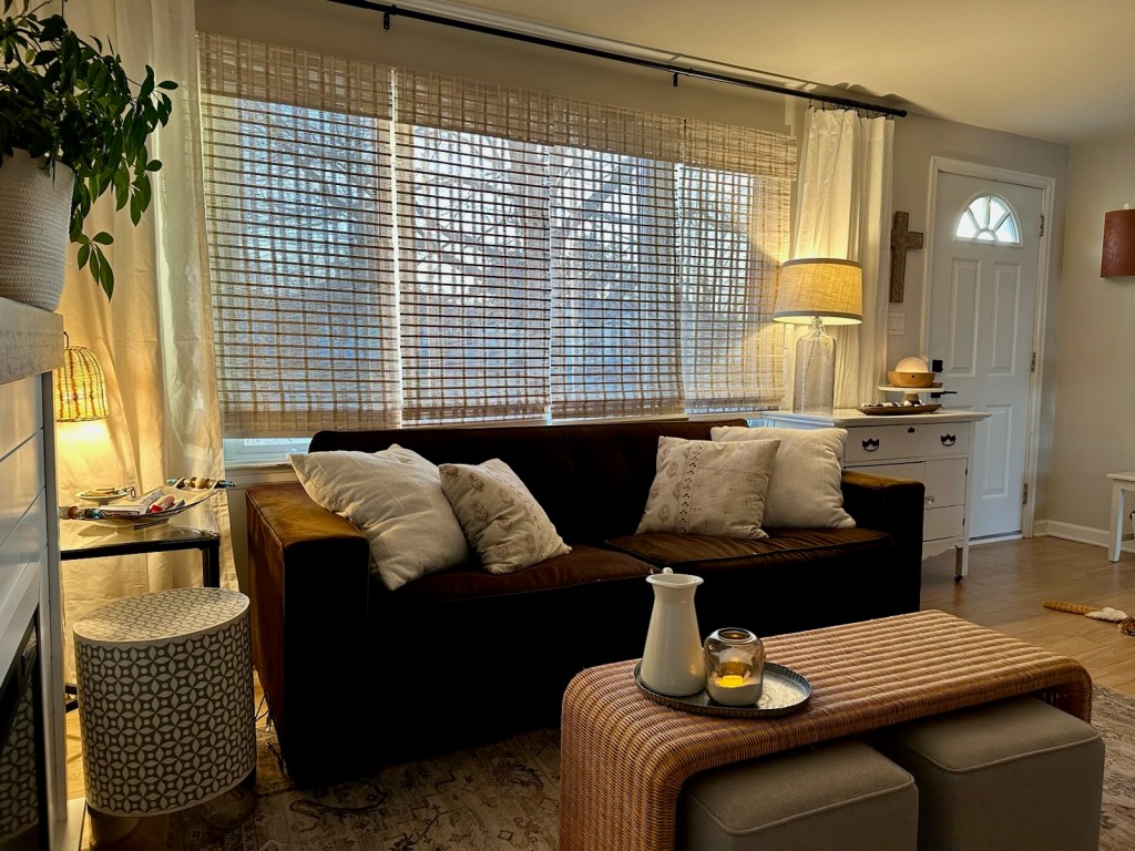 After simplifying and making what I had work, I took inventory of what missing pieces could be added to tie everything together. I went for a new lamp in the corner that matched my coffee table and shades, and some white curtains and pillows to match…well, most other things in the room. The final touches I added work in every space: plants, and candles.