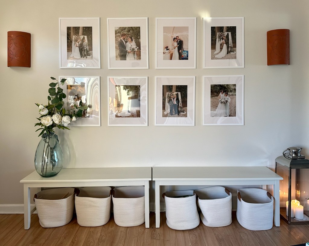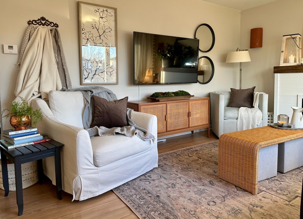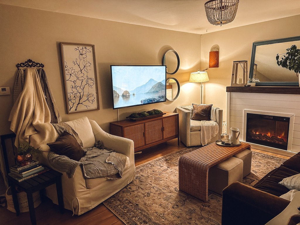 Get creative with decor! Instead of tossing our throw blankets in a basket, I hung them on the wall for texture and warmth. Another great trick I have been using is to set the TV to display a piece of art by searching for art on youtube.