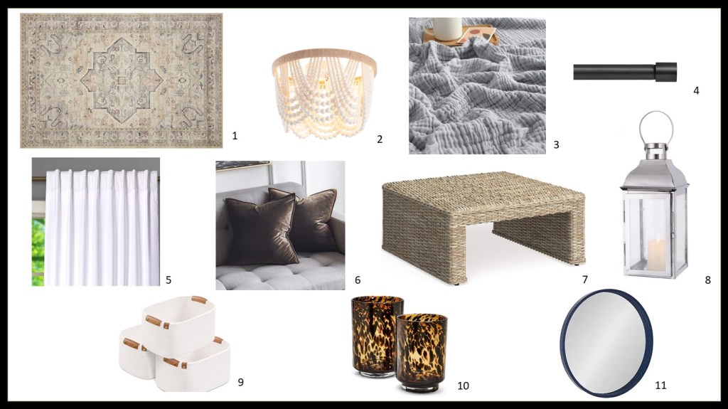 1. Rug 2. Light 3. Blanket 4. Curtain Rod 5. Curtain Panels 6. Pillow Case 7. Coffee Table 8. Lantern 9. Baskets 10. Tortoise Glass Candle Holder 11. Round Mirrors