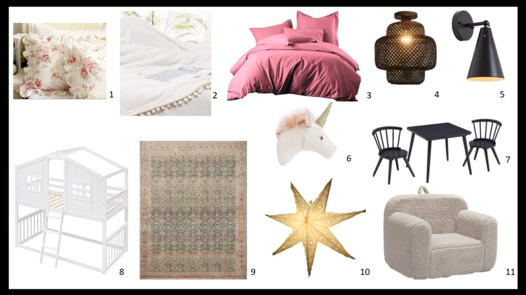 - Pillowcase 2. Blanket 3. Duvet 4. Ceiling Light 5. Sconce 6. Unicorn 7. Kids Table 8. Bed 9. Rug 10. Star Light 11. Chair