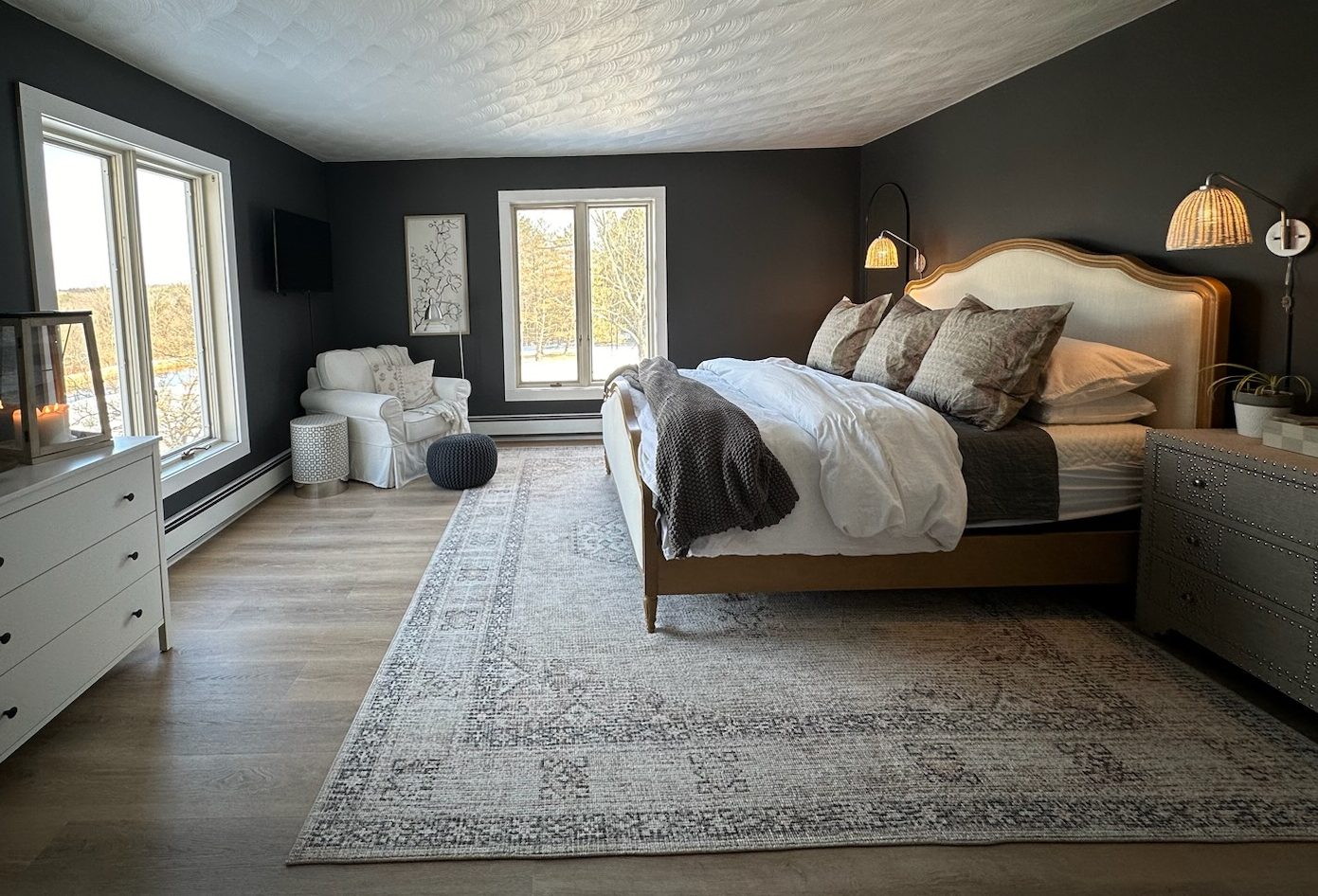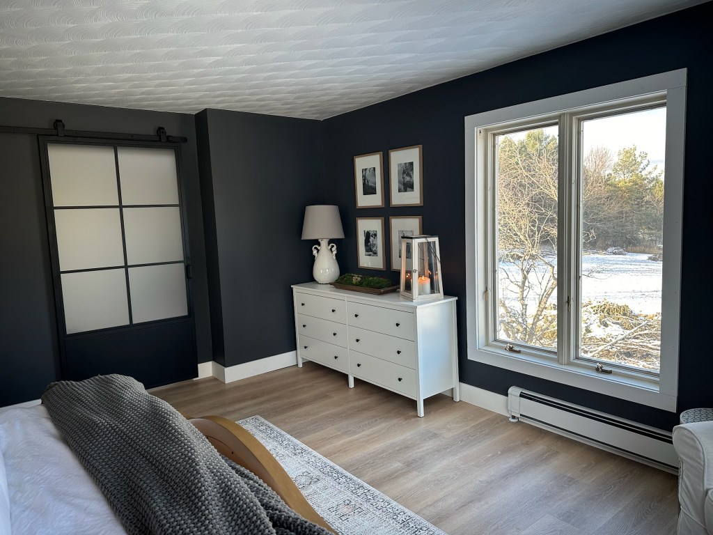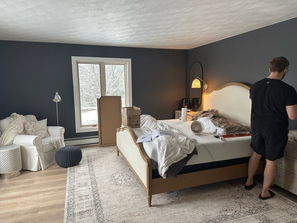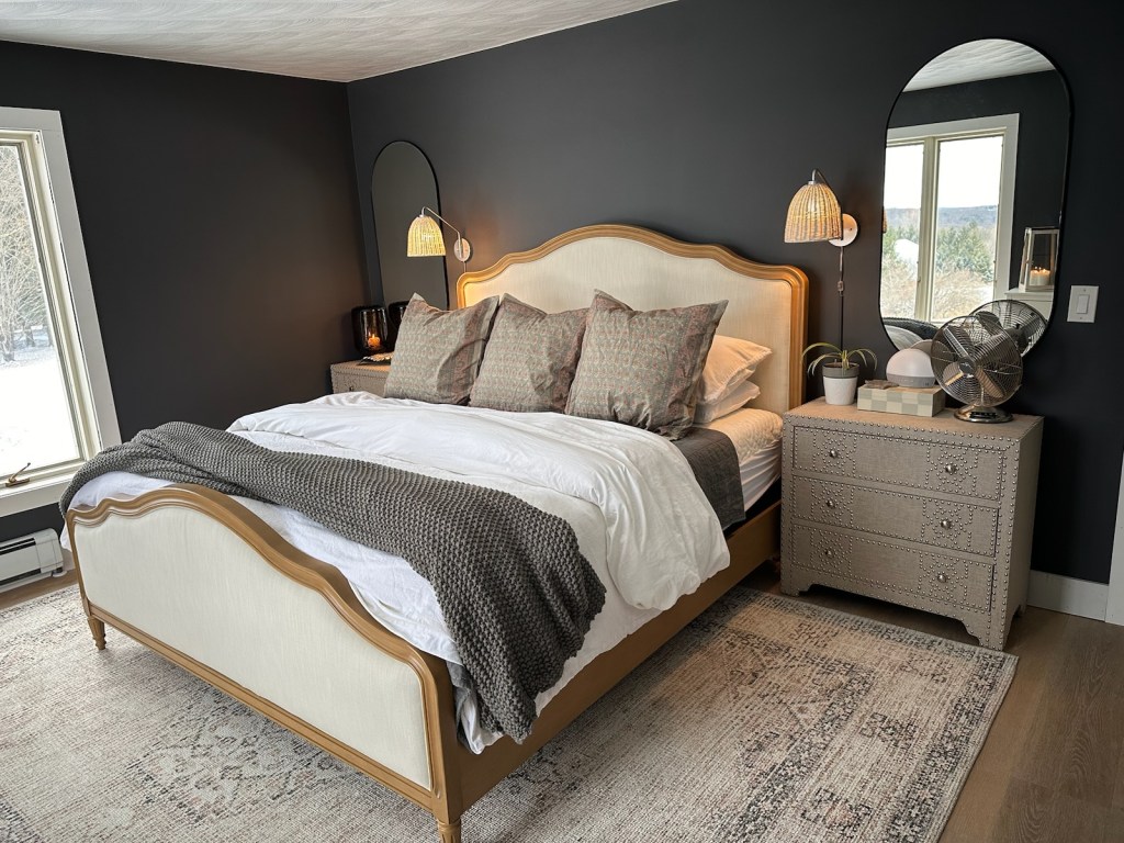Something unconventional we did in this room was add a wall. Most renos involve knocking walls down and opening space (we will be doing plenty of that elsewhere), but for this room, adding a wall was the right call. We did this to create a space for the primary bath. An upcoming project that will be such a relief as it will be the bathroom that not only we use, but our kids, and guests will use as well. Even with dividing the space, our bedroom is still about 20’x15′ and very spacious.