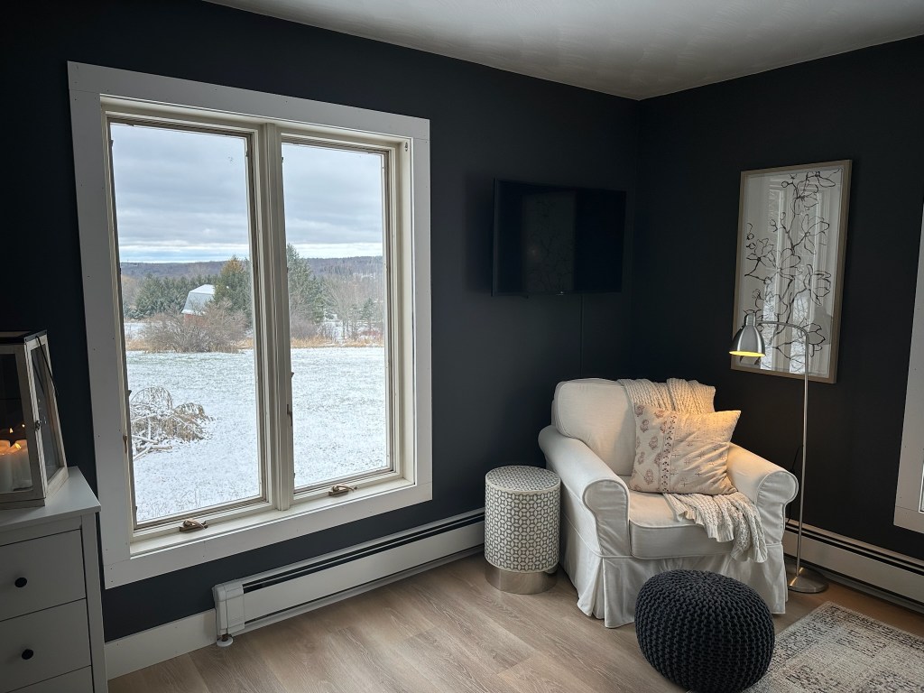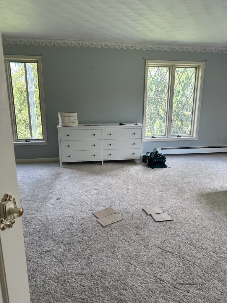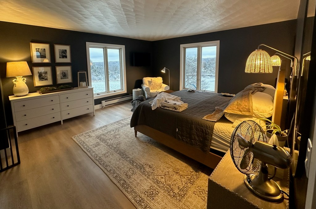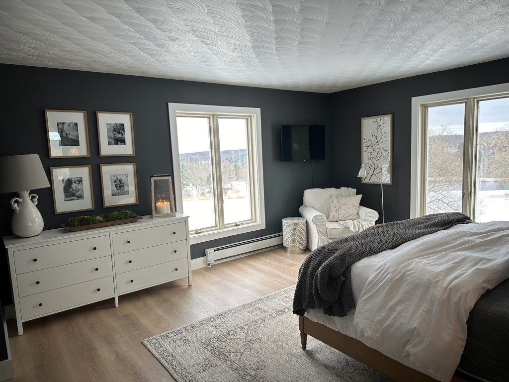 Something unconventional we did in this room was add a wall. Most renos involve knocking walls down and opening space (we will be doing plenty of that elsewhere), but for this room, adding a wall was the right call. We did this to create a space for the primary bath. An upcoming project that will be such a relief as it will be the bathroom that not only we use, but our kids, and guests will use as well. Even with dividing the space, our bedroom is still about 20’x15′ and very spacious.