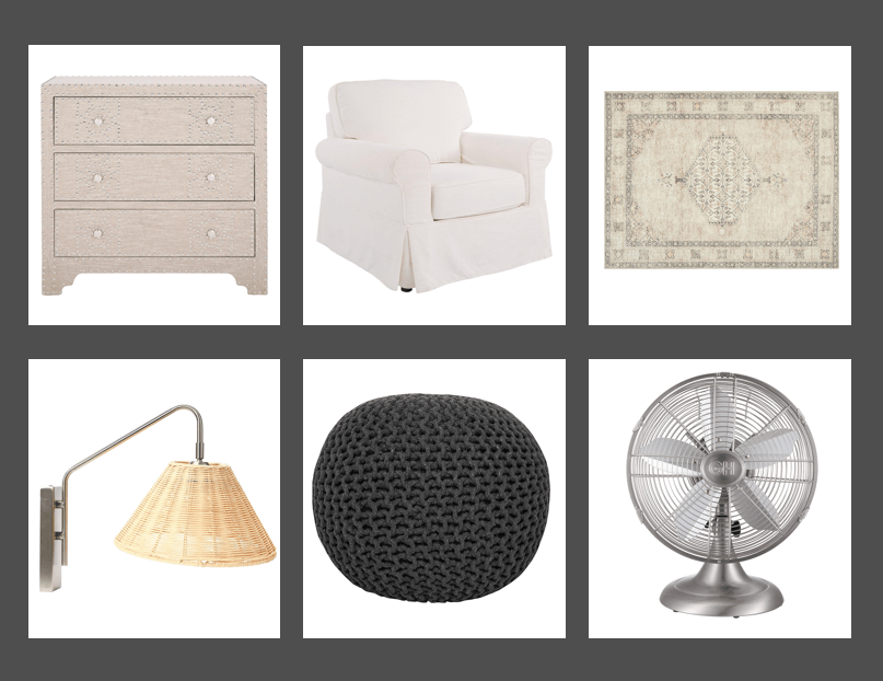 1. night stands  2. rug3. chair  4. sconce5. poof6. fan
